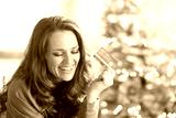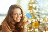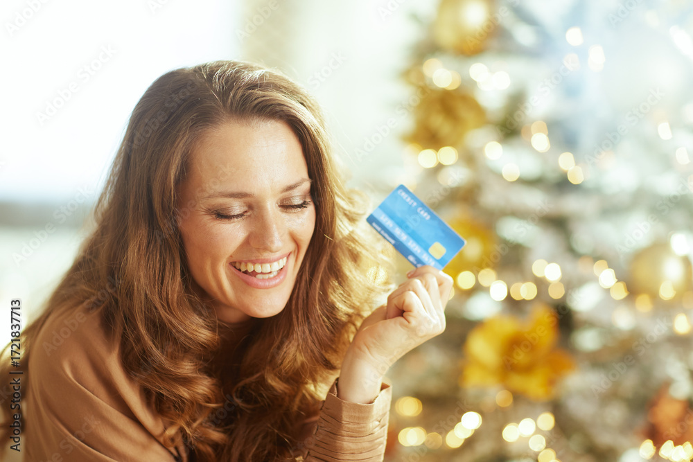A smiling woman with long brown hair holds a blue credit card, ready for holiday purchases. Behind her, a softly lit Christmas tree with golden ornaments sets a cheerful, festive mood.