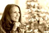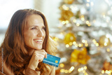 A smiling woman with long brown hair holds a blue credit card, engaged in online holiday shopping. A softly lit Christmas tree with golden ornaments provides a festive backdrop.
