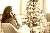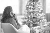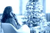 A woman with long brown hair, wearing satin blouse, sits in white chair, engrossed in phone conversation. A softly lit Christmas tree with golden ornaments creates warm and inviting holiday ambiance