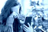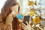 A close-up captures distressed woman, hand over eye, crying while holding credit card and smartphone, reflecting intense financial worry or holiday spending disappointment.