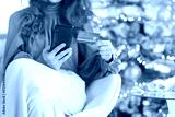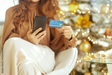 A woman with wavy hair sits comfortably in armchair, engaging in online holiday shopping with smartphone and credit card. A softly blurred, warmly lit Christmas tree creates cozy, festive atmosphere