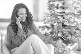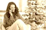 A smiling woman with long brown hair, dressed in brown blouse and beige pants, sits in white chair, talking on cell phone. A softly lit Christmas tree and festive table create warm, holiday ambiance