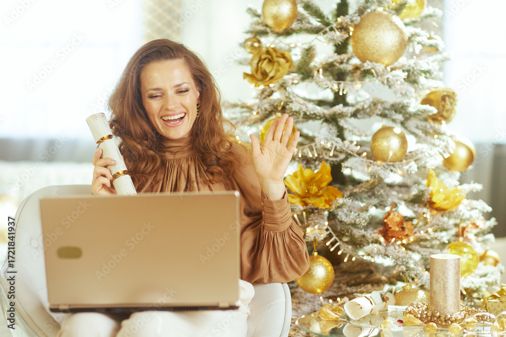 A woman with long brown hair, wearing brown blouse, sits in white armchair, holding Christmas cracker. She waves at laptop against decorated Christmas tree, conveying joyful virtual holiday greeting.