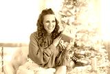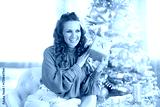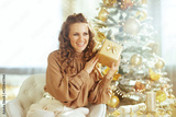 Smiling woman with curly brown hair sits in armchair, holding gold gift box with bow. A decorated Christmas tree with lights and ornaments creates warm, festive backdrop for this joyful holiday scene