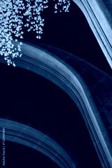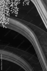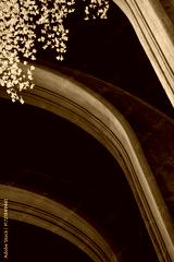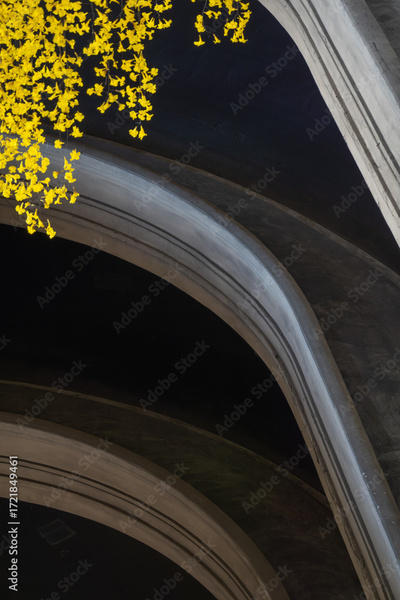 Bright yellow blossoms drape beside sweeping arches in dark space creating dramatic contrast and architectural elegance