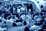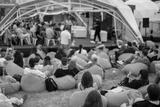 Crowd relaxes outdoors on orange bean bags as presenter speaks under shelter, with seating screens vibrant event atmosphere diverse attendees engage in discussion and listening.