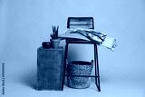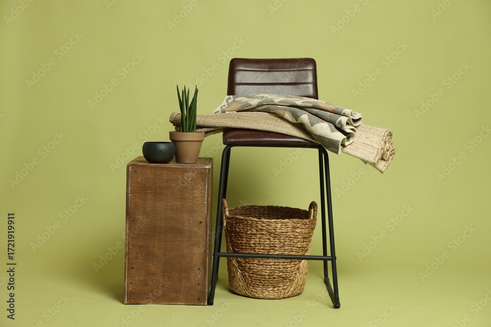 Stylish bar stool and other used stuff on olive background
