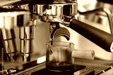 Coffee machine brewing espresso in to glass cup.Barista while preparing and working with coffee machine and making espresso coffee from arabica coffee beans.