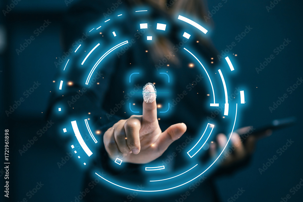 A businesswoman uses fingerprint authentication on a digital interface, symbolizing biometric security, identity verification, and safe access in modern technology systems.