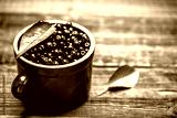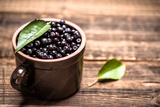 Chokeberry. Bowl of fresh aronia berries with leaves on wooden table.