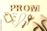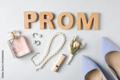 Flat lay composition with word Prom made of wooden letters, boutonniere and accessories on white background