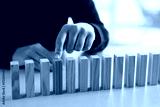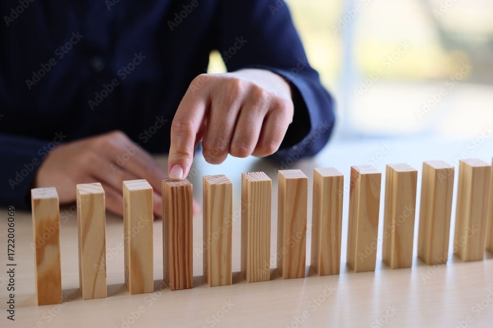 Risk. Woman pointing at domino tale at table, closeup