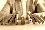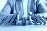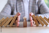 Risk. Woman stopping domino effect to protect wooden figure at table, closeup