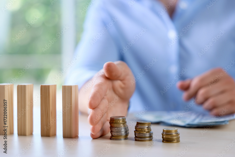 Risk. Man stopping domino effect to protect coins at table, closeup