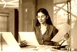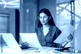 Young woman wearing glasses diligently reading and comparing financial reports and papers at her desk while working on a laptop in a contemporary office environment