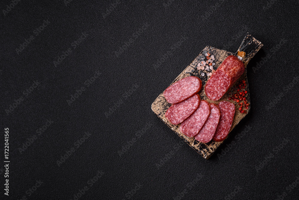 Sliced salami sausage, smoked meat as a delicacy for the table. Salami sausage