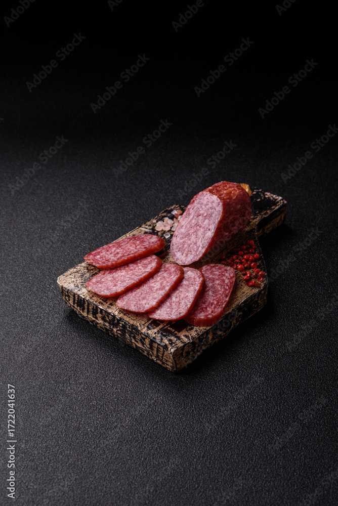 Sliced salami sausage, smoked meat as a delicacy for the table. Salami sausage