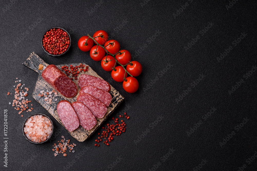 Sliced salami sausage, smoked meat as a delicacy for the table. Salami sausage