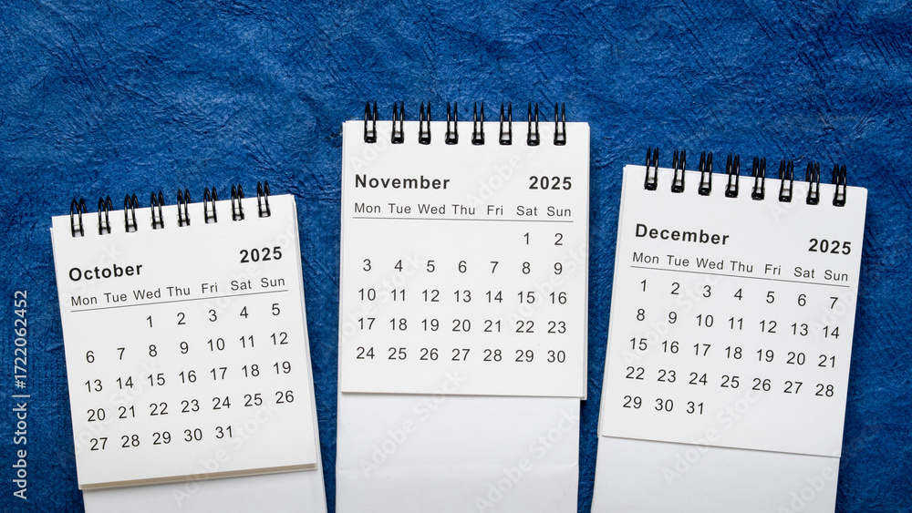 October, November and December 2025 - small spiral desktop calendars, time and business concept
