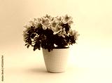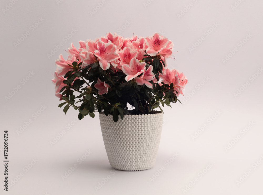 Pink Azalea flower bouquet.in pot on beige gray Natural light; shadow minimalist still life background.