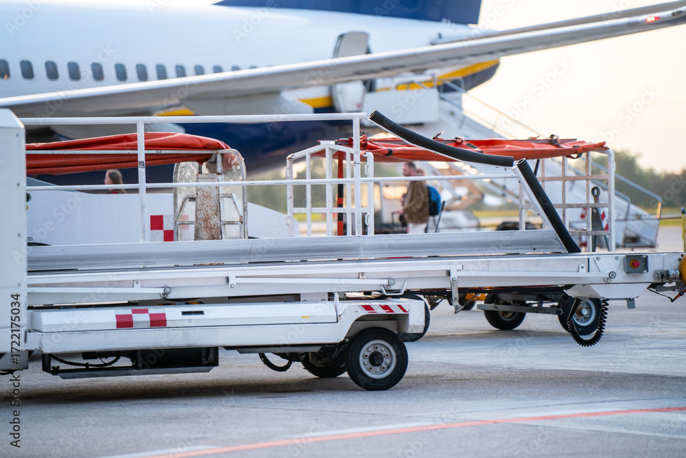 Baggage handling carts and service equipment parked beside passenger aircraft on runway surface symbolizing airline logistics, cargo management and modern airport infrastructure