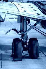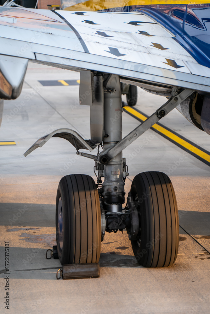 Airplane landing gear with dual tires and structural support on tarmac symbolizing aviation technology, engineering strength, commercial air travel and safety systems