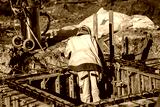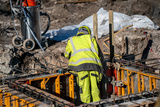 Construction worker in high-visibility safety gear installing reinforcement and framework at foundation site with heavy-duty equipment and structural supports for civil engineering concrete works