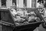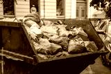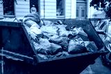 Metal container loaded with gray bags of debris placed in front of city house symbolizing renovation cleanup, household waste removal and everyday urban process of construction material disposal