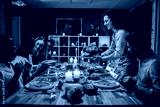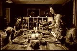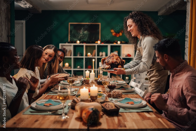 Friends celebrating thanksgiving, enjoying roasted turkey and festive meal