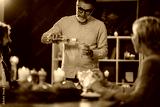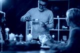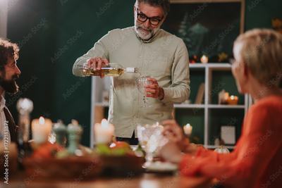 Senior man pouring white wine for family and friends during thanksgiving dinner