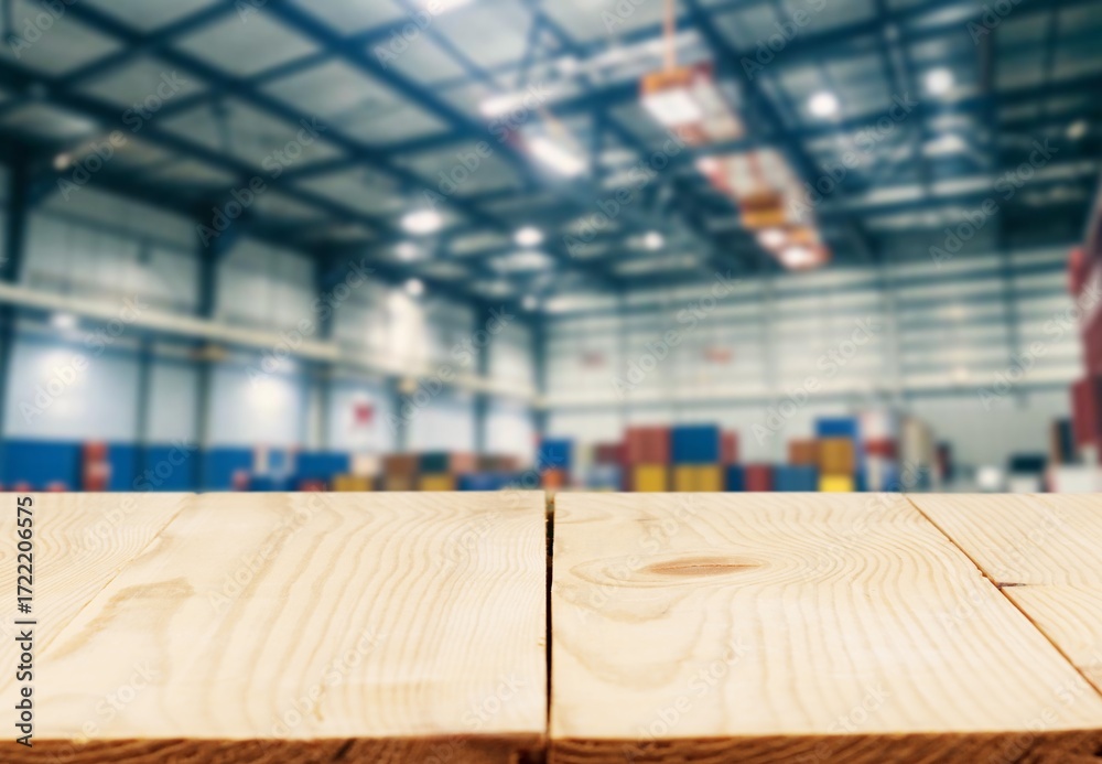 blurred background of modern factory and tabletop in foreground.