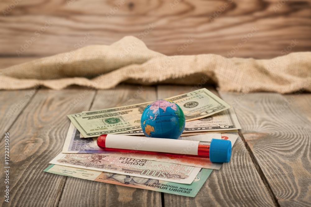 Covid-19 vaccine cost concept. Bottle vaccine on money