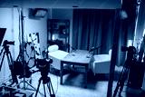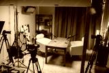 The interior of a recording studio is equipped with professional filming equipment for recording podcasts, interviews, and TV shows. A small film studio.