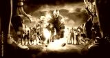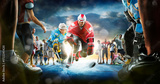 The multi sports collage including boxing, ice hockey, basketball, cycling, soccer, american football, fitnes, gym, baseball, volleyball with ice hockey player in the main role on the grand arena
