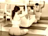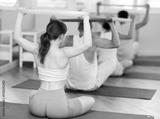 Slender young girl doing arm and shoulder workout with resistance band sitting cross-legged in pilates studio in group