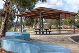 Modern park shelter with a metal roof and picnic tables, surrounded by concrete seating and trees in a landscaped suburban park in Australia. Recreational infrastructure, community gathering spaces
