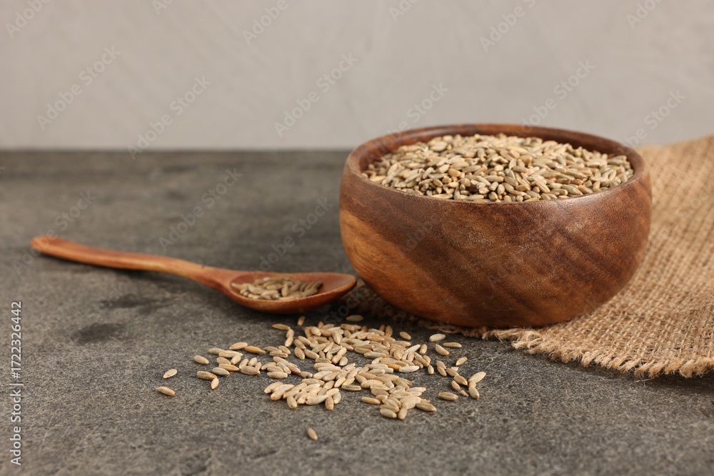Rye grains in bowl and spoon on grey table, closeup