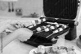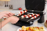 Woman cooking skewers with meat and vegetables on electric grill at home, closeup