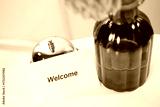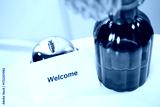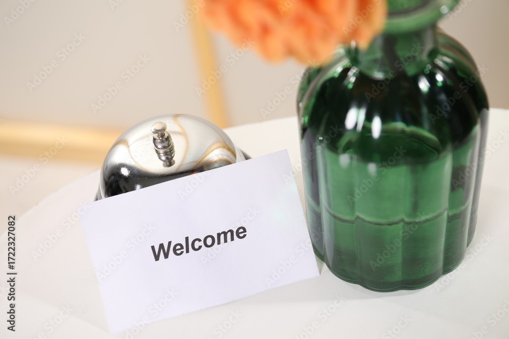 Card with word Welcome, desk bell and vase with flower on white table indoors, closeup