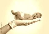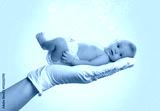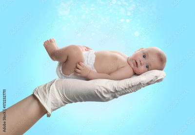 In vitro fertilization (IVF). Cute little baby in doctor's hand against light blue background