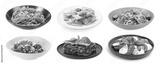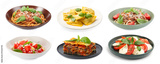 Seasoned taste. Collection of dishes with added basil on white background