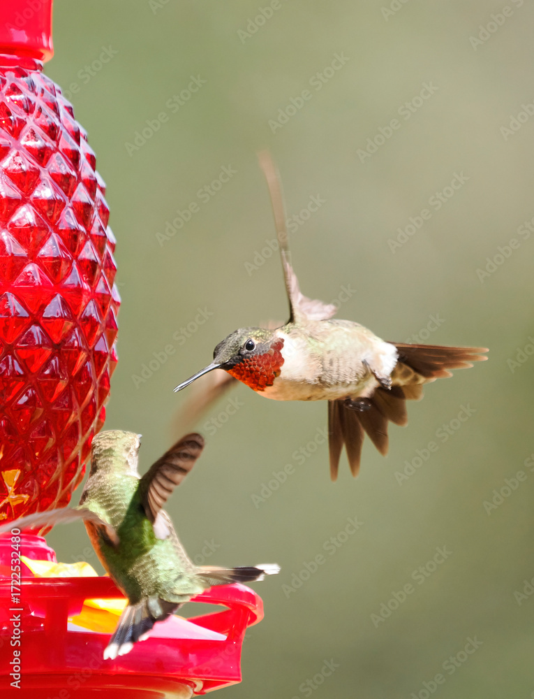 A Close-up Image of a Male Ruby Throated Hummingbird Protecting It's Feeder from a Female Hummingbird