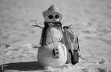 Snowman traveler with backpack on snowy adventure. Festive snowman tourist wearing sunglasses outdoors. Winter journey with snowman and holiday decorations. Snowman ready for New Year trip with