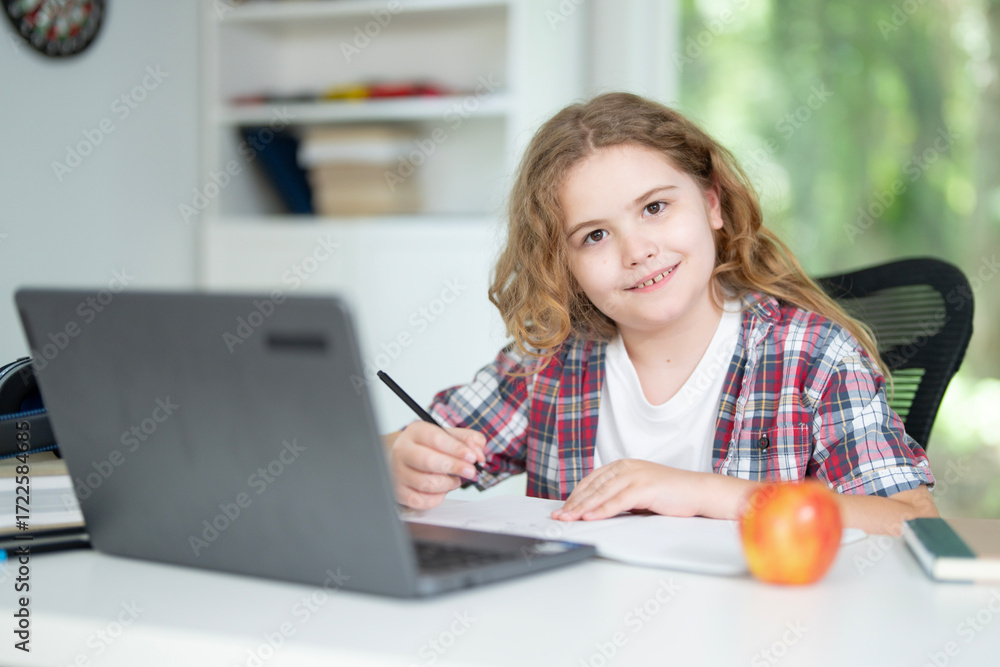 Child gaining knowledge in home school. Kid studying online lesson at home. Young student focused on education in home school. Boy learning new skills and knowledge during homeschool class.
