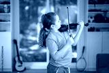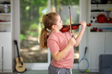 Teen playing violin. Classic musical instrument. Child artist enjoying violin practice. Young musician learning song on violin. Kid practicing violin in childhood room.
