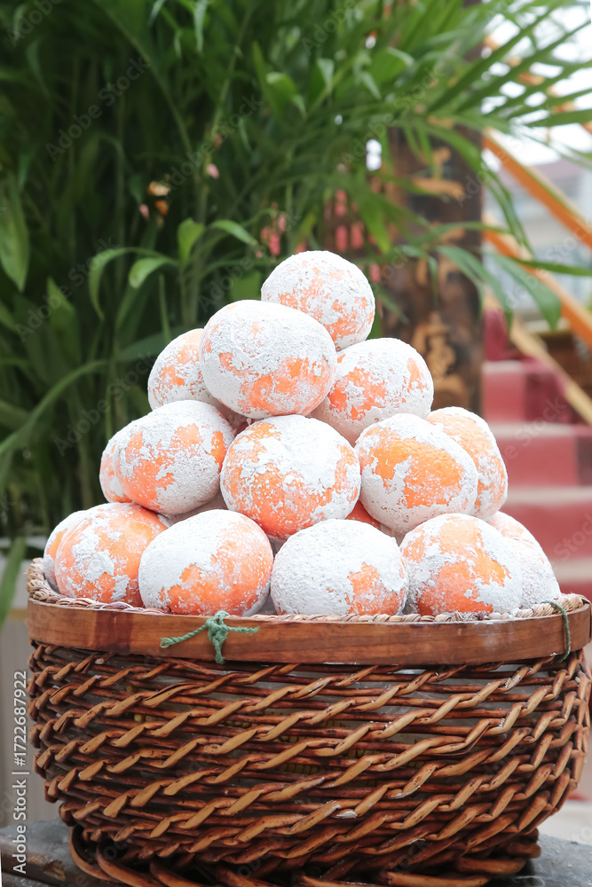 Fresh Citrus Fruits in Bamboo Basket Guangxi China Traditional Agriculture Display