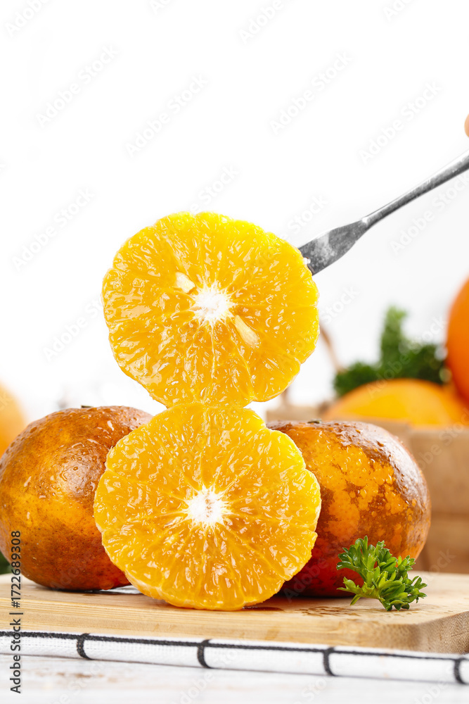 Fresh Orange Slices on Fork with Whole Citrus Fruits on Wooden Cutting Board Kitchen Scene
