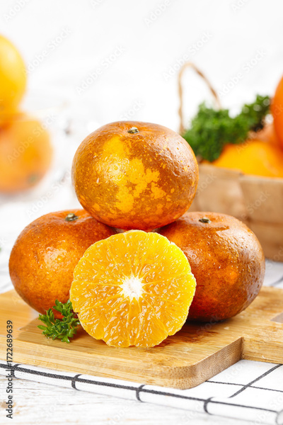 Fresh Orange Citrus Fruits on Wooden Board Guangxi Plateau Organic Produce Healthy Food Photography