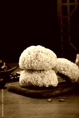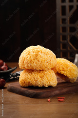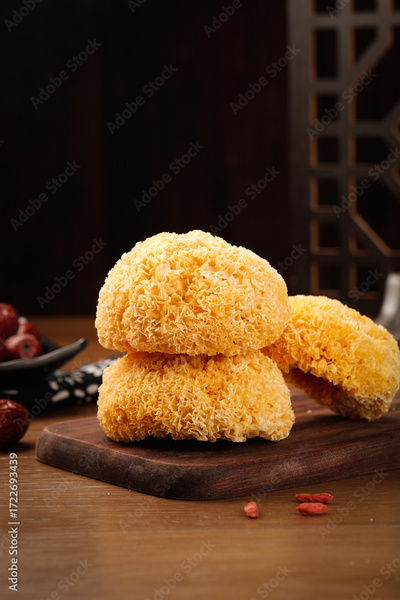 Dried White Silver Tremella Mushrooms Gutian Fungus on Wooden Board