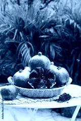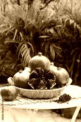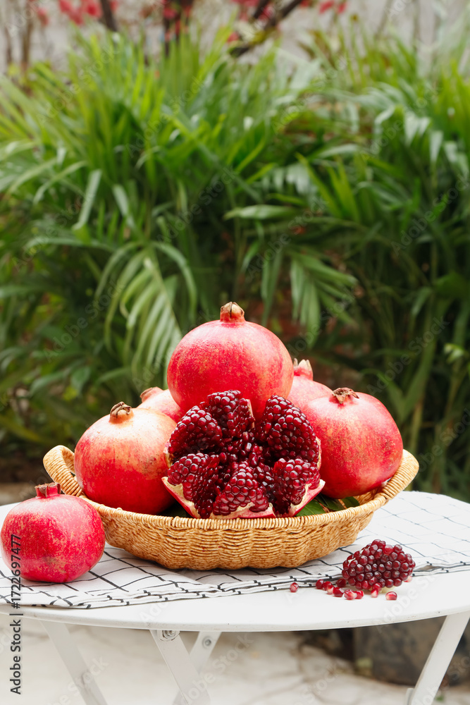 Fresh Pomegranates in Wicker Basket with Exposed Ruby Red Arils and Seeds in Garden Setting